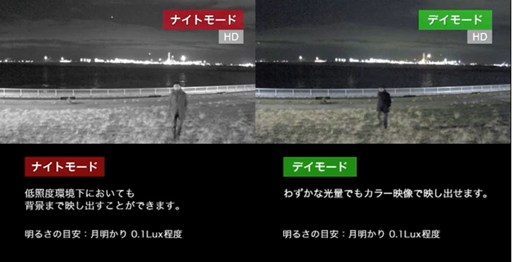 | デイナイト | ![]() 明るい場所はカラーで撮影し、暗くなると自動的に白黒映像に切り替わり、低照度での撮影を可能にします。 |