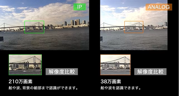 | 解像度 | ![]() アナログカメラは約38万画素(ブラウン管の画質と同等)に対し、フルハイビジョンカメラは約210万画素と、人物や文字が従来よりも認識しやすくなりました。 オフィスでは重要物の監視、来訪者や社員の入退室監視に、商店ではレジ周りでのトラブル対策等、様々なシーンで活用していただきやすいスペックです。 |