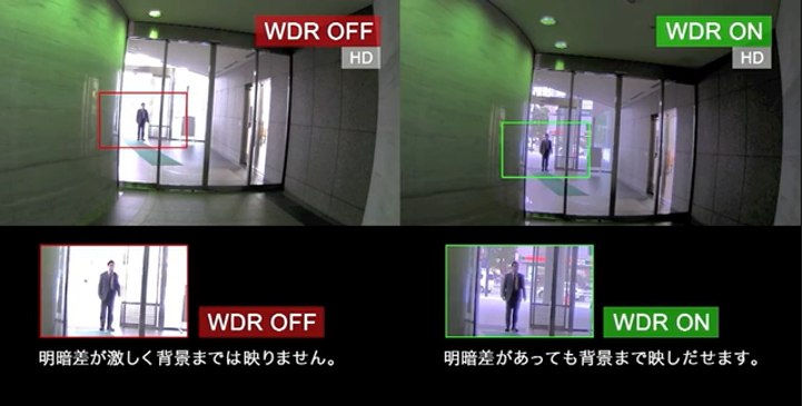 | ワイドダイナミックレンジ | ![]() 明暗差のある場所で撮影をした場合、映像内の明るい場所と暗い場所の両方を、自然な状態で見ることができるよう、映像を補正します。 |