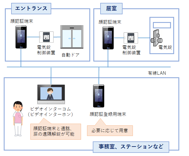 ・ビデオインターコム(ビデオインターホン)1台に対して、複数の顔認証端末を接続。通話(発信)、扉の電気錠を遠隔解錠できます。