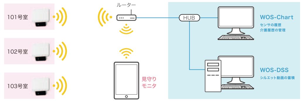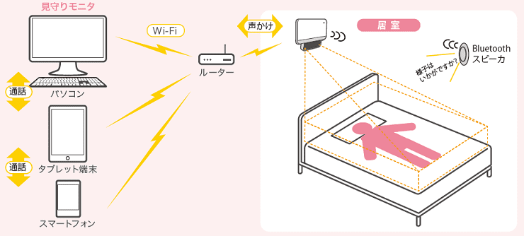 シルエット見守りセンサは、見守りモニターに見守られている方の動きに合わせた通知をお知らせします。